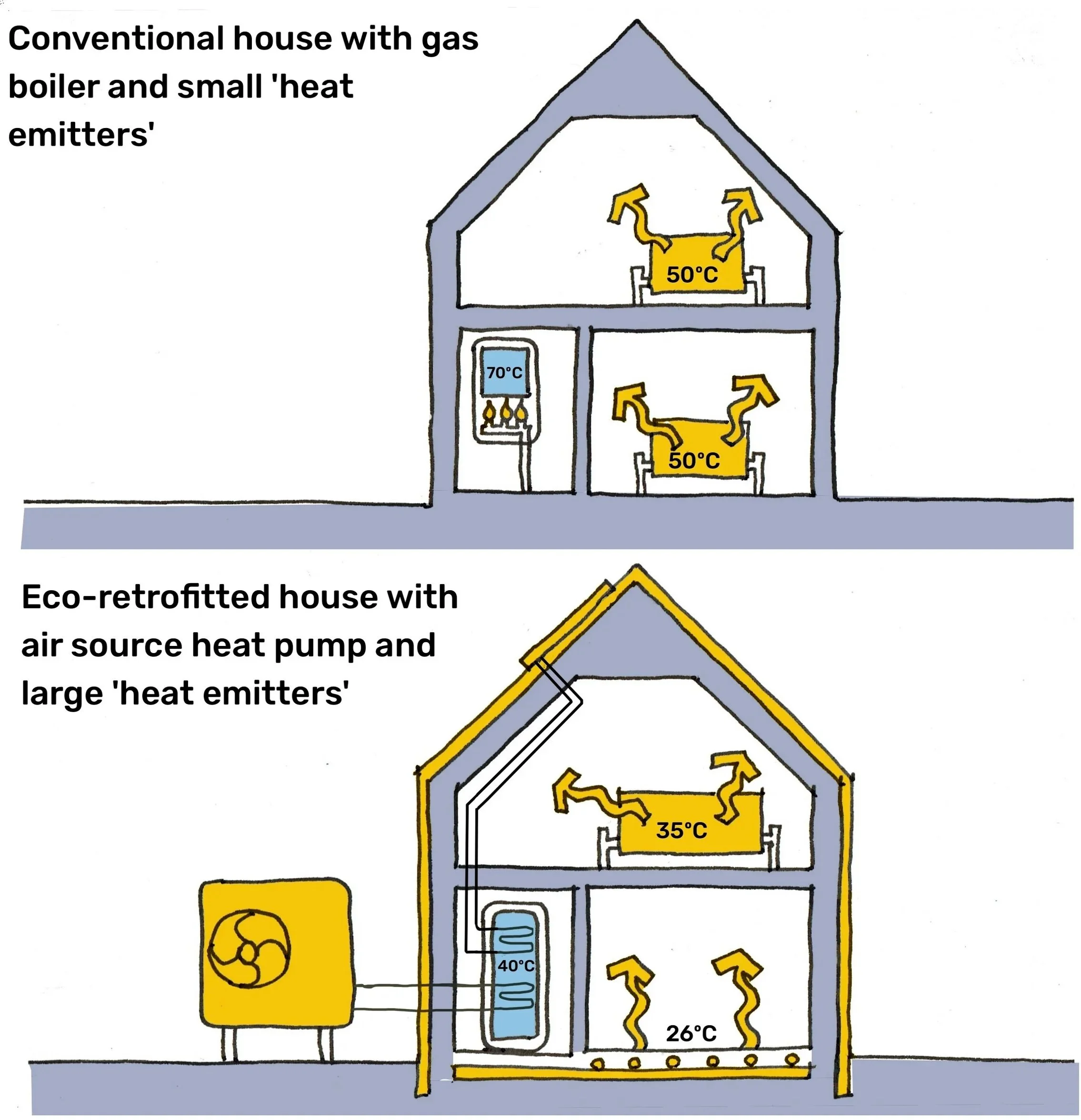 Gas boilers can easily make 70ºC flow temperatures but not so heat pumps. To work cost-effectively, heat pumps should be designed to work with flow temperatures ideally no higher than 40ºC. This typically requires either larger ‘heat emitters’ (radiators, underfloor heating etc), more thermal insulation or a combination of both. Image credit: Deeper Green