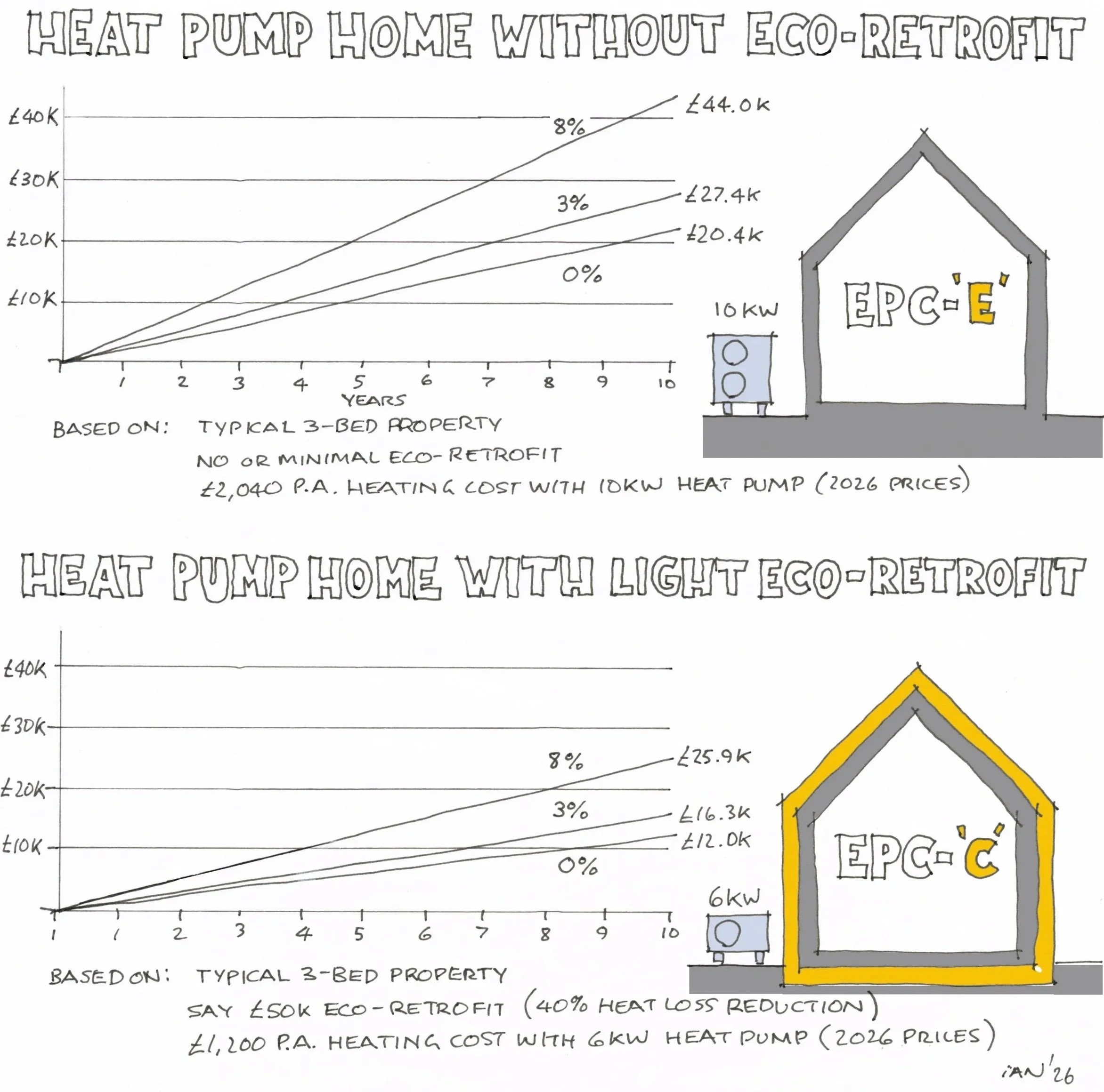 The above comparison is based on direct research carried out by Deeper Green. It takes energy calculations from a number of properties where we have looked for the sweet spot of energy efficiency upgrades (something like a 40% reduction in heating load) over that of an untreated house. It then compares the running costs over a 10 year period (2026 prices used) with varying degrees of energy price inflation factored in. Based on payback periods alone, it has always been tricky to justify fabric efficiency upgrades. Image credit: Deeper Green