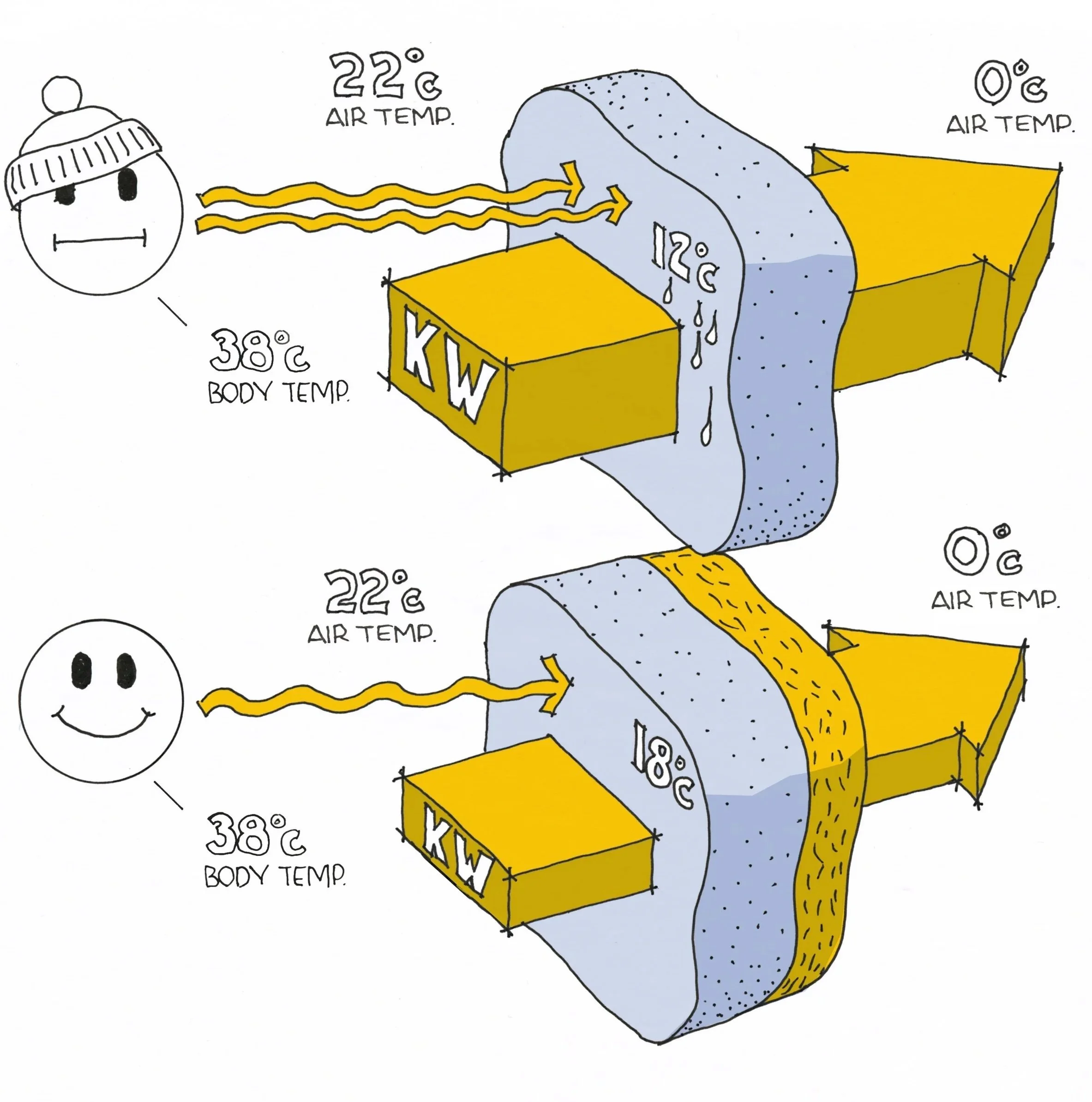 Even if you can raise air temperatures to a satisfactory level, if surrounding surfaces are much colder than you are, you will continue to feel thermal discomfort. In fact, your body will emit radiant heat energy to the colder surface. Imagine the rate of heat loss as if it were a conveyor belt going through the building fabric – the more insulation, the slower the conveyance to outside. Image credit: Deeper Green