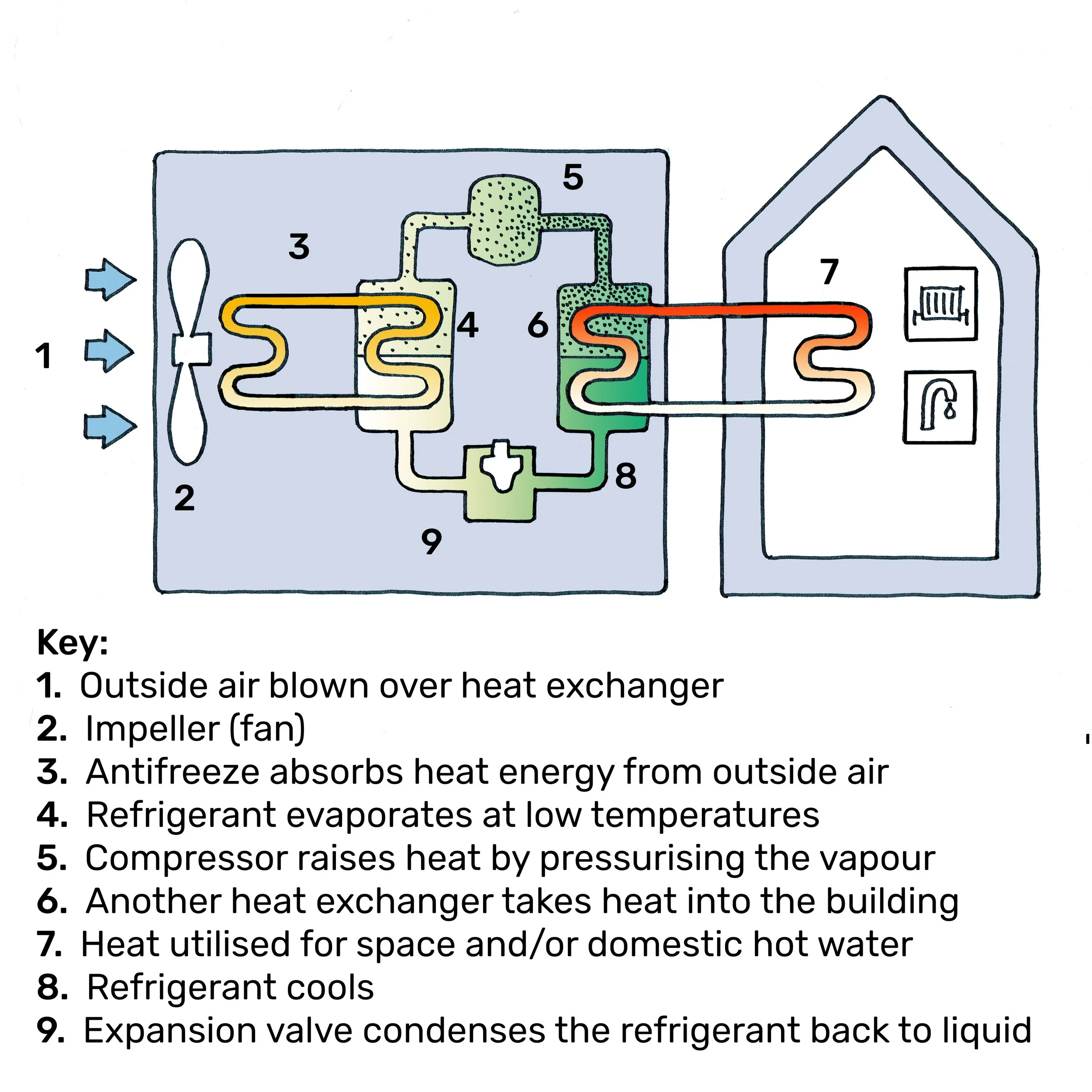 The workings of an air source heat pump shown schematically. Image credit: Deeper Green