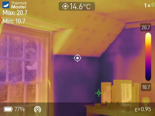 Thermal imaging by Deeper Green, done at the property after the works were completed, revealed many successes, not least the sloped ceilings (skeilings) which received the wood fibre insulation and lime plaster. This has radically reduced heat loss and improved thermal comfort conditions in the bedrooms. In an earlier phase of work most of the external walls had been treated with injected cavity insulation. Not all though. The above wall clearly has not received any thermal insulation and remains a concern.