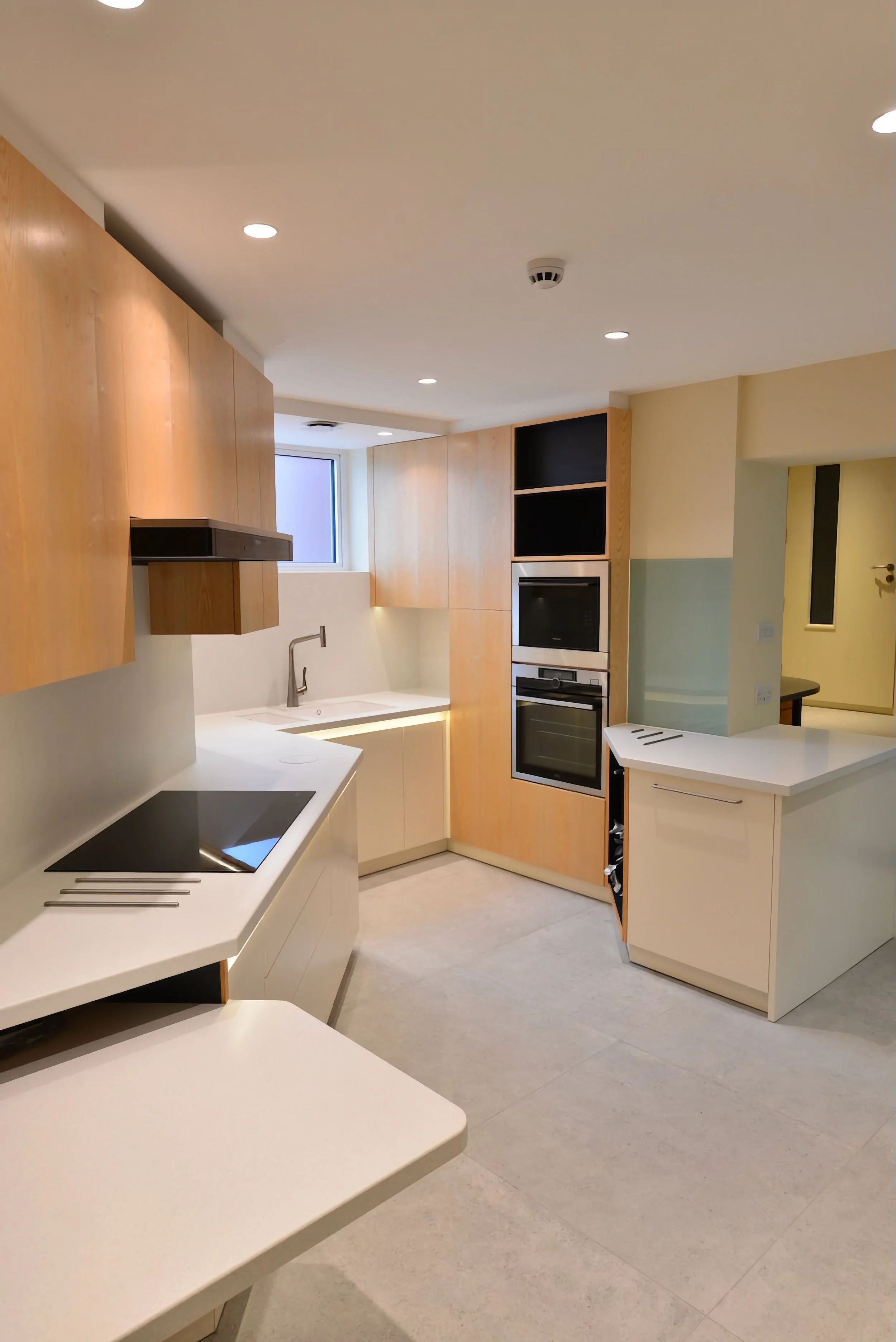 The architectural handling of the interiors and exteriors took inspiration from the short-lived, but now much-admired, post-war phase of English Brutalism, which is very much the tradition within which the original townhouses were conceived. Deeper Green worked closely with the clients to derive an interiors palette of materials and colours that would bring a contemporary twist to the post-war aesthetic. Ash was chosen for the ceiling finish of the new main space as well as for the fitted furniture. In part this decision recognised ash dieback disease in English woodlands.